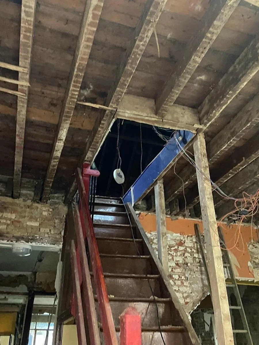 Artisan du Grand Est a pris en charge la rénovation totale de l'intérieur d'une maison de ville en Alsace. Le chantier partait d'un état brut extrême : charpente apparente, murs en briques nues, câblages électriques en désordre, escalier vétuste et sol inexistant. Résultat après travaux : un intérieur entièrement transformé, avec un escalier en bois neuf, des murs lisses et peints en blanc, un plafond refait et une circulation intérieure lumineuse et fonctionnelle.